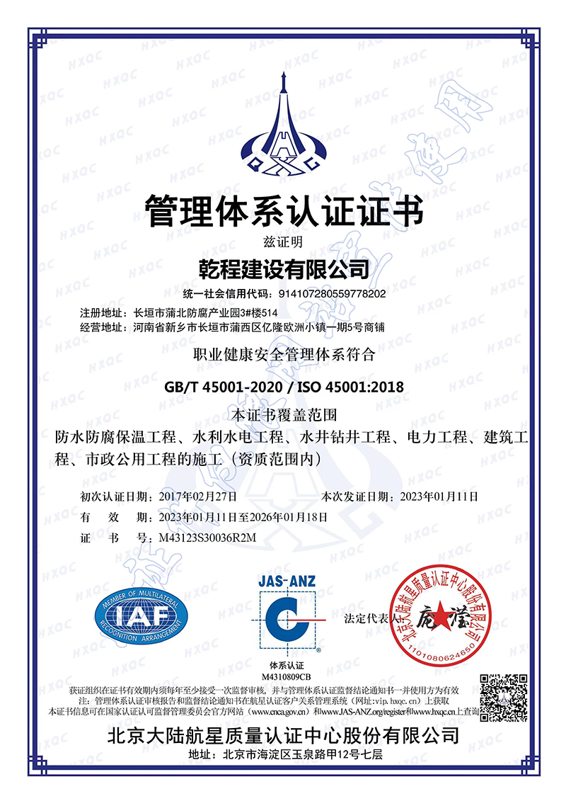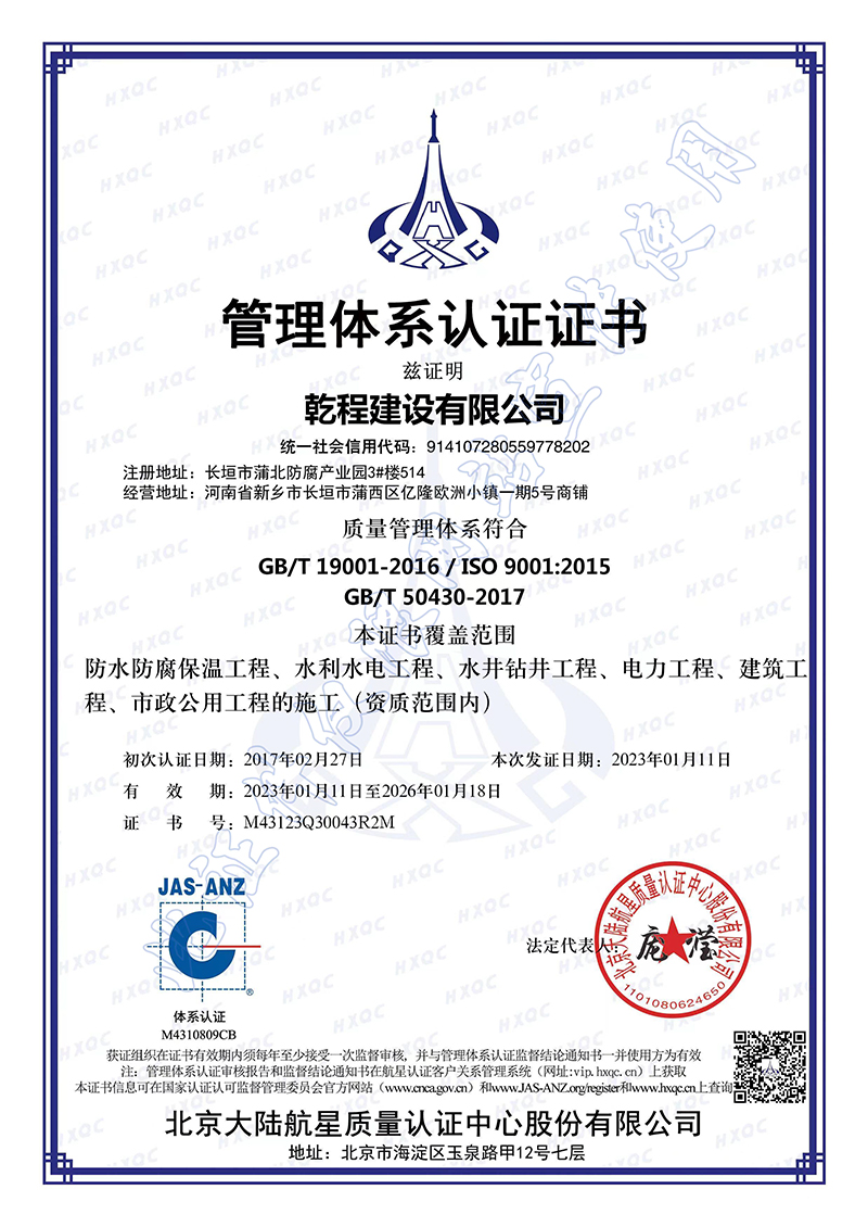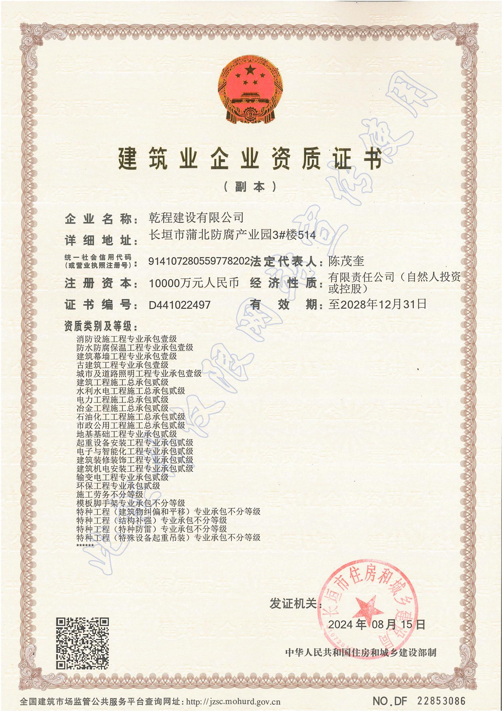 乾程建設有限公司成立于2012年10月,具有機電工程施工總承包壹級資質,建筑工程、電力工程、水利水電工程、冶金工程、石油化工工程、市政公用工程總承包貳級資質;鋼結構、防水防腐保溫、消防設施、建筑幕墻、城市道路照明、古建筑工程專業承包壹級資質,建筑機電安裝、建筑裝飾裝修、輸變電、環保、地基基礎、起重設備安裝、電子與智能化工程專業承包貳級和模板腳手架、施工勞務、各類特種工程等資質;取得了承裝(修、試)電力設施許可證,通過了ISO9001質量管理體系、ISO14001環境管理體系、GB/T45001職業健康安全管理體系認證。