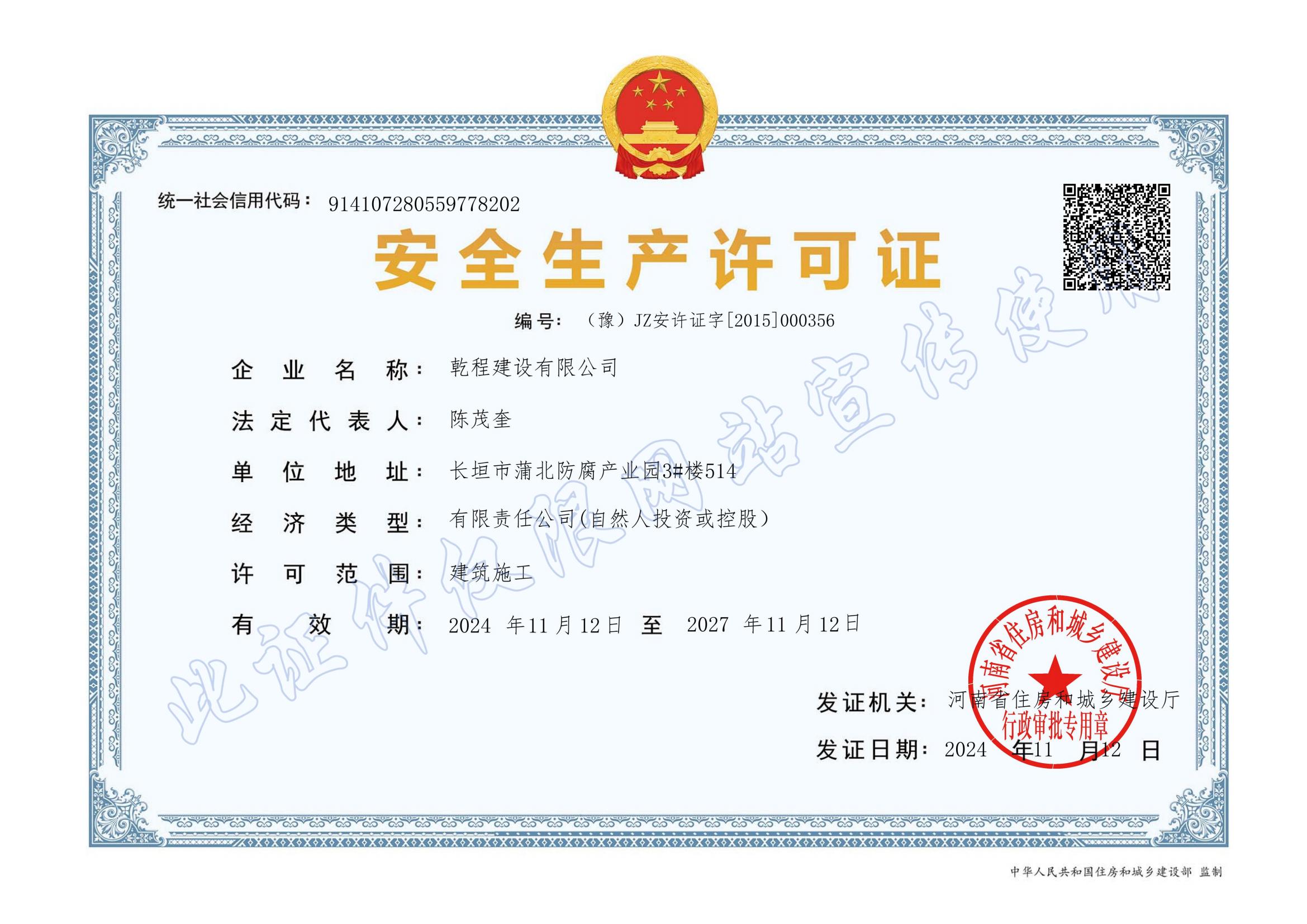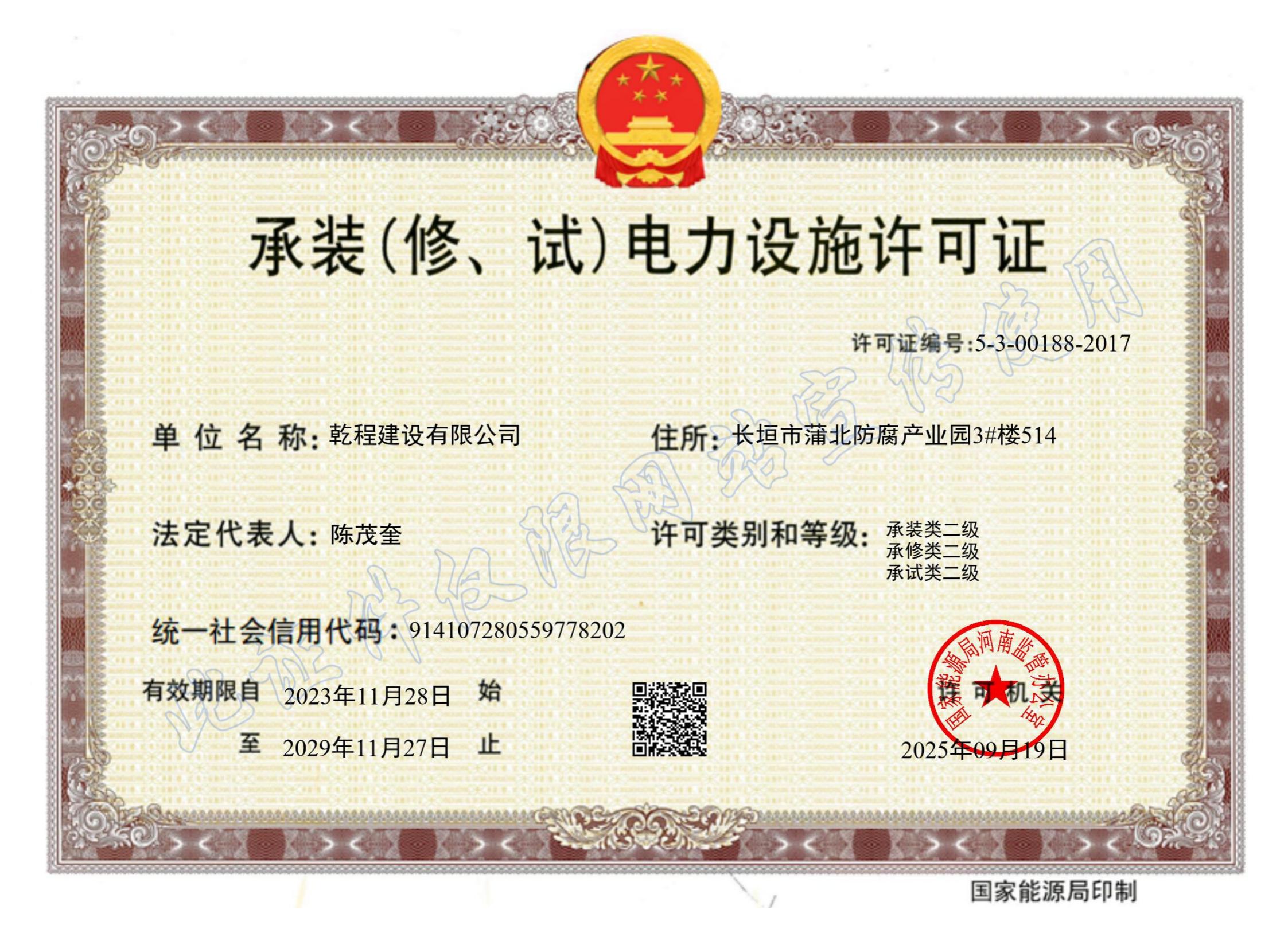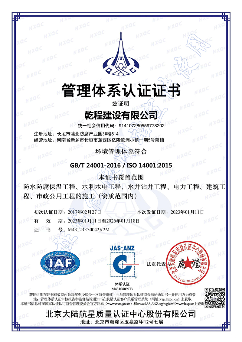 乾程建設有限公司成立于2012年10月,具有機電工程施工總承包壹級資質,建筑工程、電力工程、水利水電工程、冶金工程、石油化工工程、市政公用工程總承包貳級資質;鋼結構、防水防腐保溫、消防設施、建筑幕墻、城市道路照明、古建筑工程專業承包壹級資質,建筑機電安裝、建筑裝飾裝修、輸變電、環保、地基基礎、起重設備安裝、電子與智能化工程專業承包貳級和模板腳手架、施工勞務、各類特種工程等資質;取得了承裝(修、試)電力設施許可證,通過了ISO9001質量管理體系、ISO14001環境管理體系、GB/T45001職業健康安全管理體系認證。